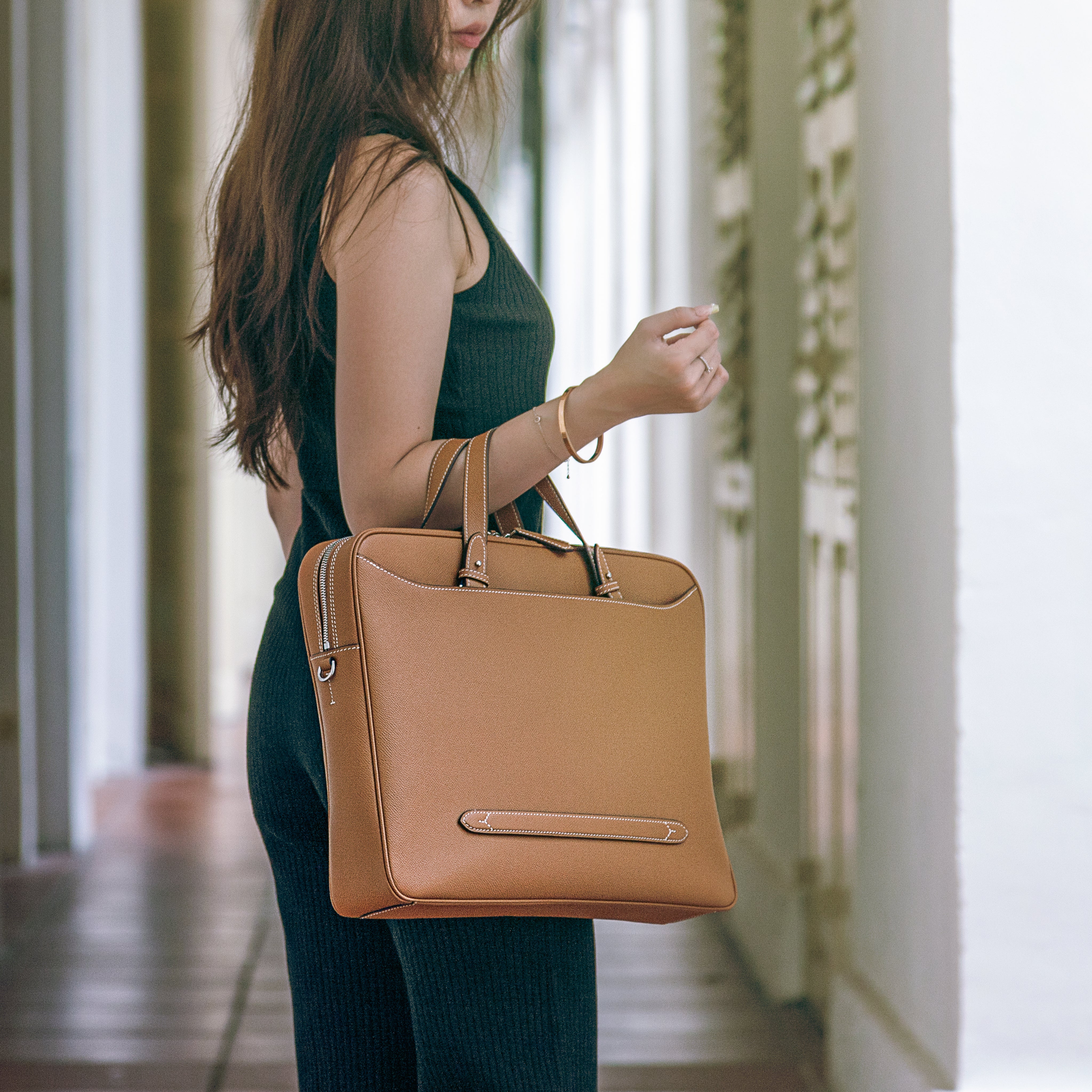 The Chelsea, embodies beautiful dignity and functionality, making it the ultimate accessory for business meetings. This stylish bag enhances your confidence, turning work into an enjoyable experience. Featuring multiple compartments for notes, documents, and chargers, the Evans ensures easy organization. Its sizable main compartment comfortably fits a 14-inch laptop, making it perfect for the professional woman who values both style and practicality.